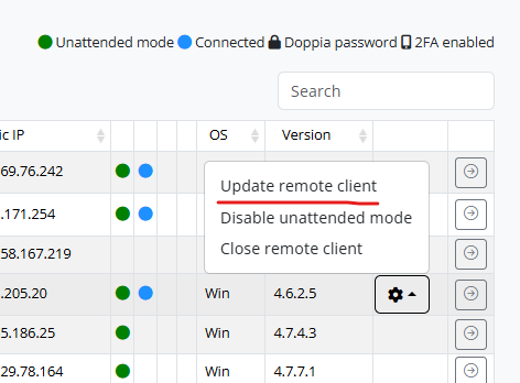 En “Computers” también es posible actualizar remotamente los clientes de Iperius Remote, así como deshabilitar el acceso desatendido o cerrar la aplicación: