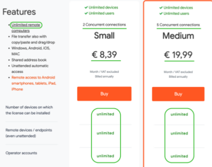 Iperius Remote, en cambio, elige un modelo de licencia mucho más flexible y conveniente , diseñado para escalar desde pequeñas a grandes empresas. Las licencias de Iperius se basan exclusivamente en la cantidad de conexiones simultáneas requeridas, mientras que todo lo demás (número de dispositivos remotos, estaciones de trabajo en las que instalar el software y número de operadores) es ilimitado en cada plan. Esto significa que incluso la licencia más pequeña le permite administrar una cantidad infinita de clientes y técnicos remotos, limitando solo la cantidad de sesiones activas que puede tener al mismo tiempo.
