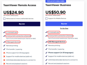 Uno de los elementos que más diferencia a Iperius Remote de TeamViewer es la relación calidad-precio de la solución, especialmente en el ámbito profesional y empresarial. TeamViewer opera con un modelo de licencia comercial relativamente caro: las licencias pagas de TeamViewer se ofrecen mediante suscripción (anual) con diferentes niveles (Business, Premium, Corporate). Por ejemplo, la licencia Business (para un solo operador, una sesión a la vez) comienza en alrededor de 298,80 € por año ( Comparar TeamViewer Remote vs Iperius Remote – Capterra Italia 2025 ), mientras que los planes multiusuario y multisesión más elevados pueden alcanzar varios cientos de euros por mes (la licencia TeamViewer Premium, requerida para 2-3 sesiones simultáneas y múltiples usuarios, cuesta más de 1000 €/año). Esta inversión suele ser sostenible para las grandes empresas, pero supone un reto para las pymes y los profesionales individuales. Aunque TeamViewer ofrece una amplia gama de funcionalidades, muchos usuarios se quejan de que el coste no es proporcional al uso que hacen de él, especialmente si se limita al soporte remoto clásico.